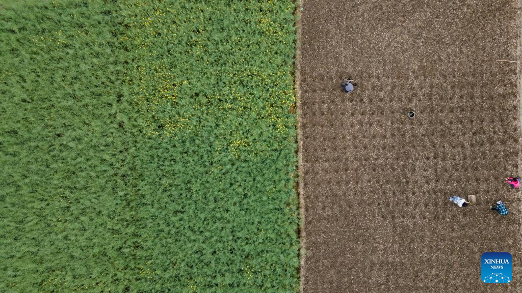 (220404) -- ANQING, April 4, 2022 (Xinhua) -- Villagers work in the fields in Xiying Village of Anqing, east China's Anhui Province, April 4, 2022. As the temperature gradually rises around the time of Qingming Festival, farming activities are in full swing across the country, from the north to the south. (Photo by Wu Junqi/Xinhua)