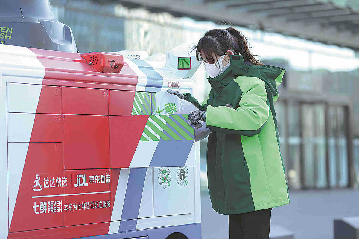 Online orders are loaded into an autonomous delivery vehicle by a Seven Fresh staff in Beijing in February. CHINA DAILY