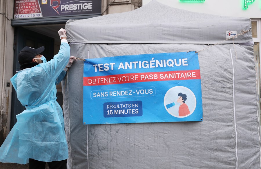 A medical staff member adjusts a sign in the wind at a fast COVID-19 test screening tent in Paris, France, April 1, 2022. (Xinhua/Gao Jing)