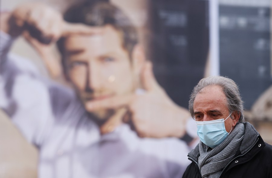 A man walks past a poster in Paris, France, Jan. 19, 2022. (Xinhua/Gao Jing)