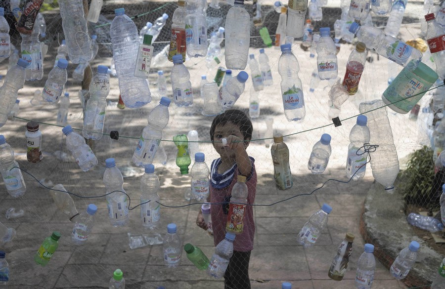 A boy views an installation made of plastic bottles during the Marine Debris Festival, held by the local community as a campaign to save the beach from plastics pollution, in Poliwali Mandar district, West Sulawesi, Indonesia, Oct. 3, 2021. (Photo by Yusuf Wahil/Xinhua)