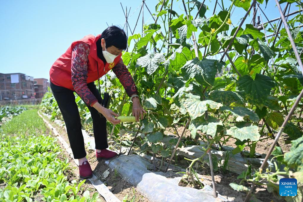 A volunteer granny picks vegetables for cooking at Xinbu Community in Quanzhou, southeast China's Fujian Province, April 5, 2022.