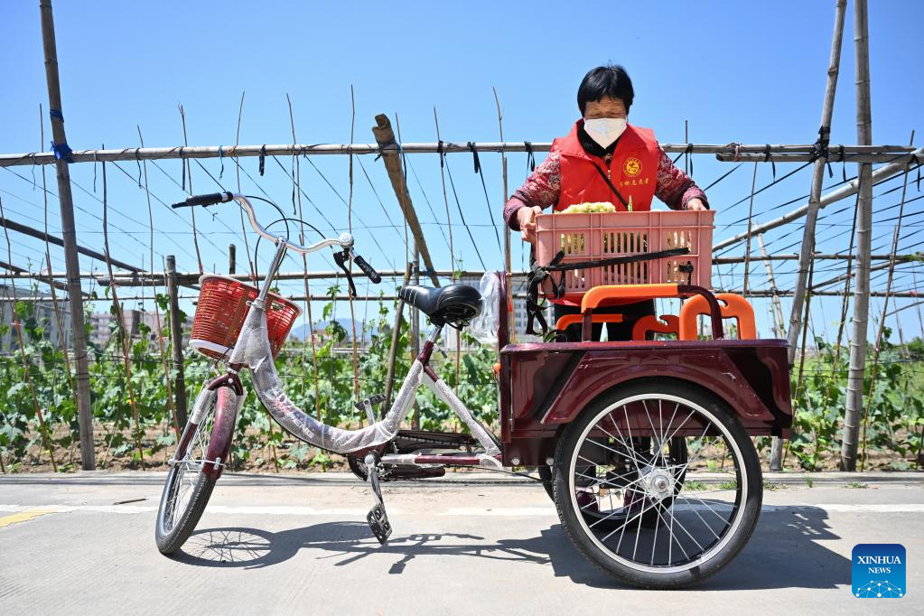 A volunteer granny loads a basket of vegetables onto a three-wheeler at Xinbu Community in Quanzhou, southeast China's Fujian Province, April 5, 2022.