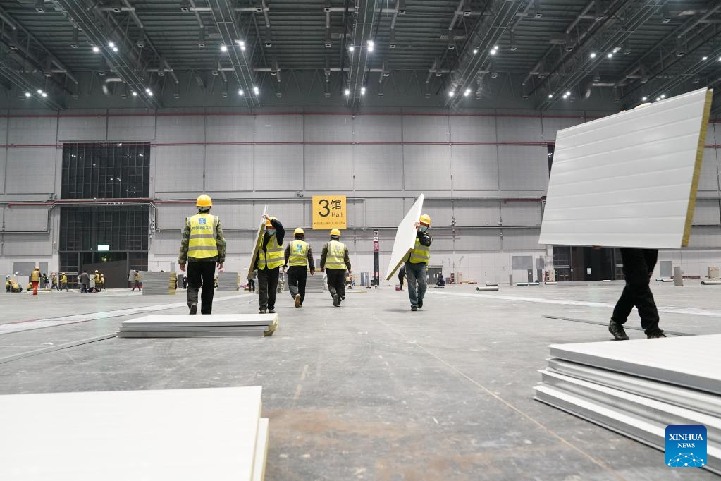 People work at the National Exhibition and Convention Center in east China's Shanghai, April 5, 2022. Shanghai is converting the National Exhibition and Convention Center (NECC) into a makeshift hospital with a planned capacity of 40,000 beds.