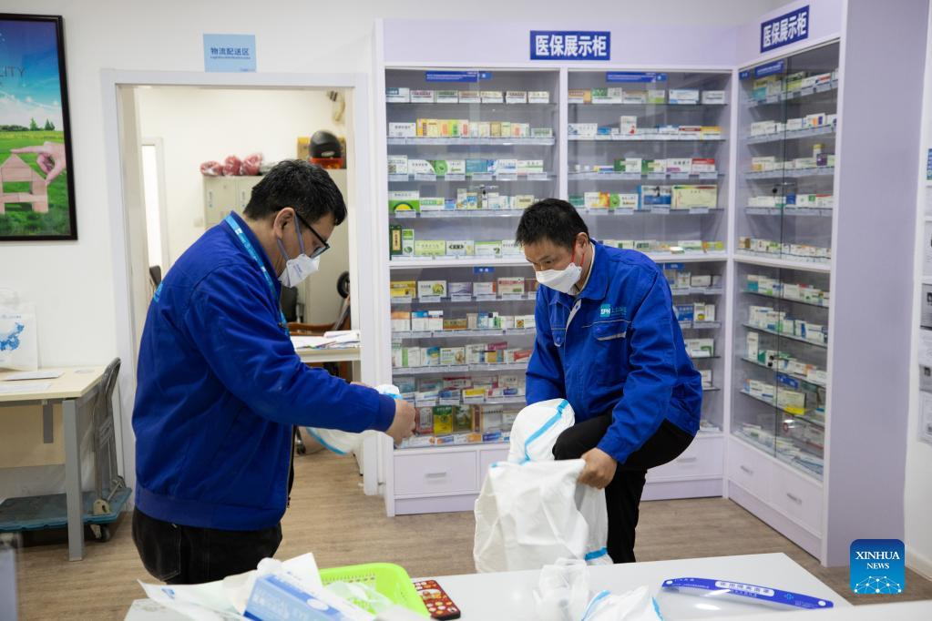 Deliveryman Ye Yifei walks out of the Shanghai Pharma E Pharmacy with medicines in Shanghai, east China, April 5, 2022. During the temporary closed-off management period in Shanghai, supply and delivery of special drugs to those patients who need them is particularly important. A pharmacy called Shanghai Pharma E Pharmacy, which sells more than 260 new drugs, special drugs and drugs for rare diseases, stays in business to supply and deliver the medicines. (Xinhua/Jin Liwang)