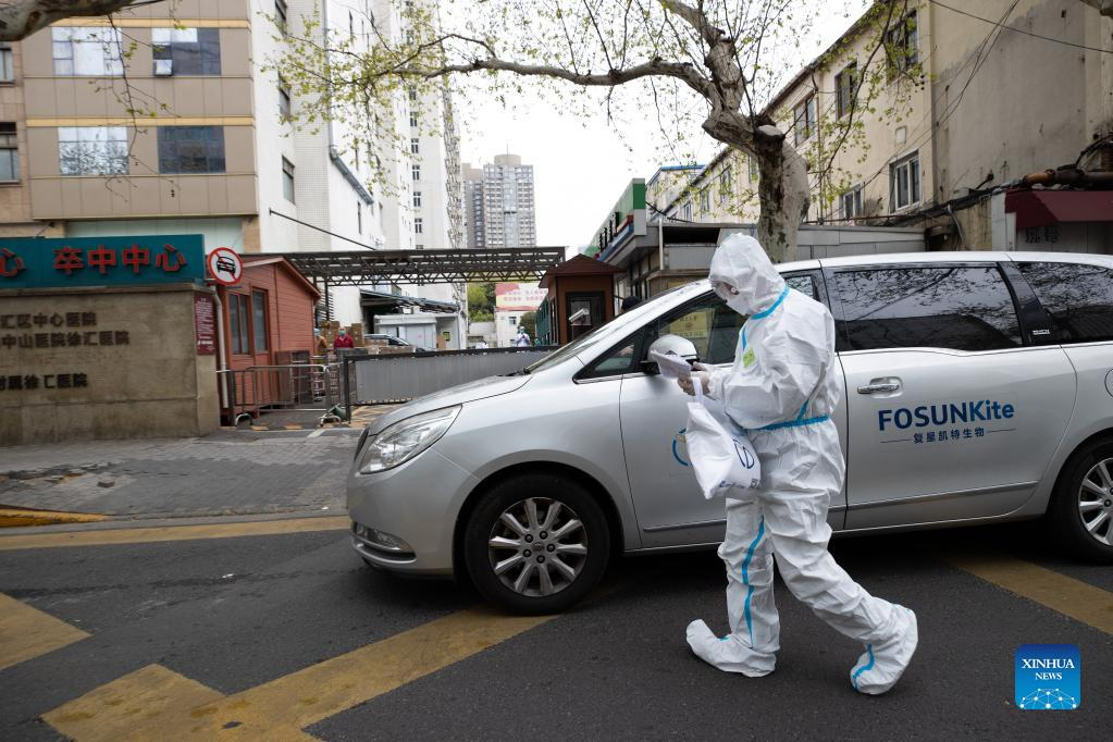 A car of Shanghai Pharma E Pharmacy delivers medicines in Shanghai, east China, April 5, 2022. During the temporary closed-off management period in Shanghai, supply and delivery of special drugs to those patients who need them is particularly important. A pharmacy called Shanghai Pharma E Pharmacy, which sells more than 260 new drugs, special drugs and drugs for rare diseases, stays in business to supply and deliver the medicines. (Xinhua/Jin Liwang)
