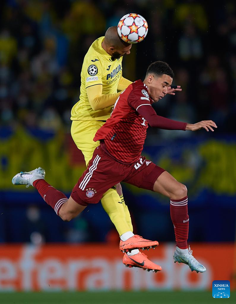 Etienne Capoue (L) of Villarreal vies with Jamal Musiala of Bayern Munich during a UEFA Champions League match between Villarreal CF of Spain and Bayern Munich of Germany at La Ceramica Stadium in Vila-Real, Spain, on April 6, 2022. (str/Xinhua)