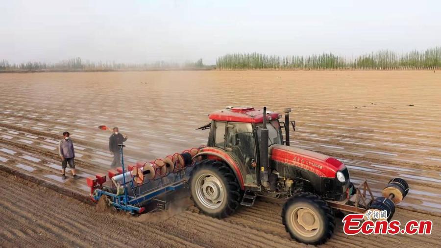 An autonomous crop-sowing vehicle with Beidou navigation system sows cotton seeds in a cotton field, Awat County, northwest China's Xinjiang Uyghur Autonomous Region, April 7, 2022. (Photo/China News Service)