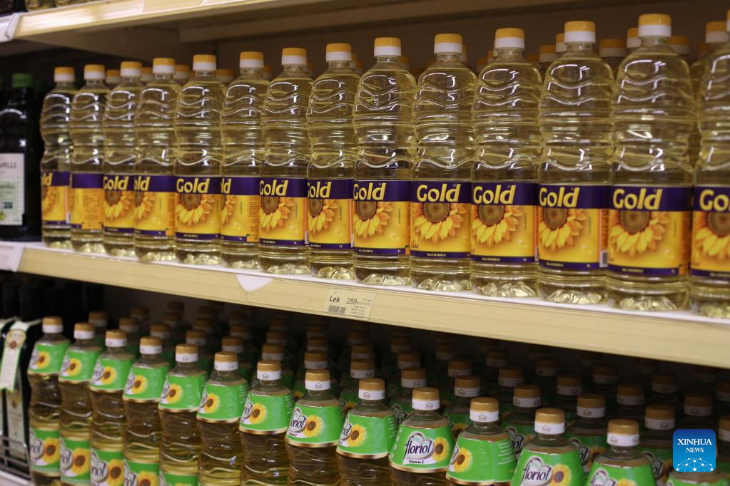 A shelf for cooking oil is seen at a supermarket in Tirana, Albania, April 6, 2022. Due to the rise of energy prices, Albanian markets witnessed the sharp price rise of fuel, cooking oil, flour, etc. (Photo by Gent Onuzi/Xinhua)