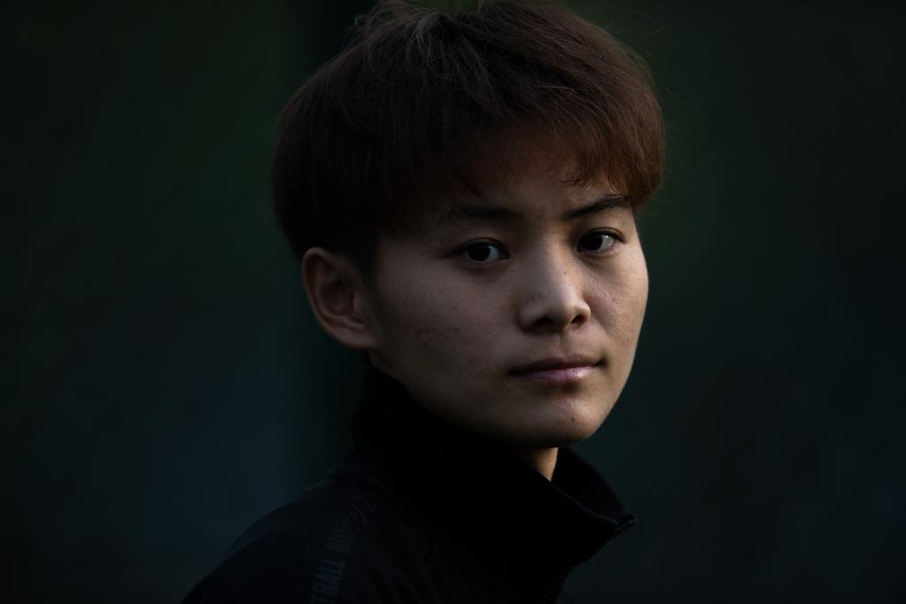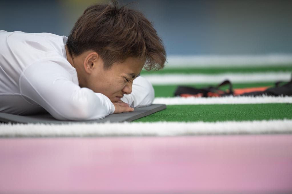 Chinese female football player Wang Shuang reacts after a training session in Wuhan of central China's Hubei Province, on April 6, 2022. (Xinhua/Xiao Yijiu)