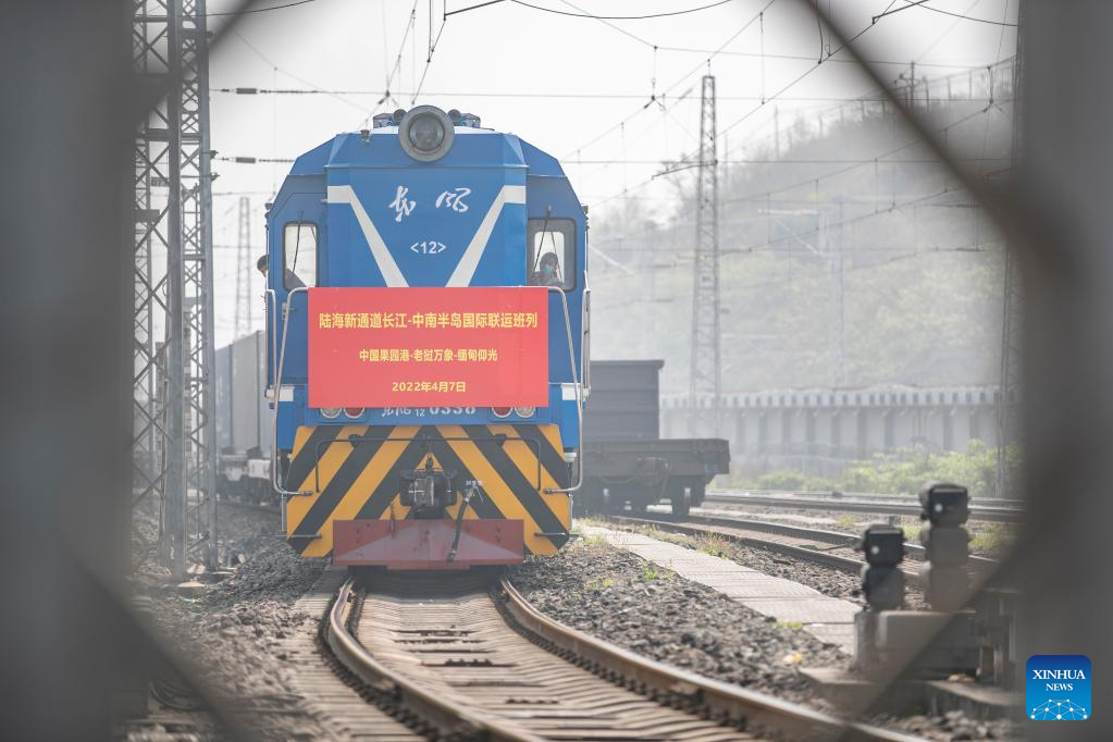 The first outbound international rail-sea freight train from China's Yangtze River to Indo-China Peninsula leaves Guoyuan Port in southwest China's Chongqing Municipality for Myanmar's Yangon, April 7, 2022.