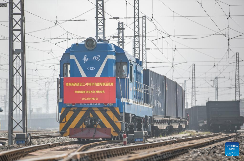 The first outbound international rail-sea freight train from China's Yangtze River to Indo-China Peninsula leaves Guoyuan Port in southwest China's Chongqing Municipality for Myanmar's Yangon, April 7, 2022.