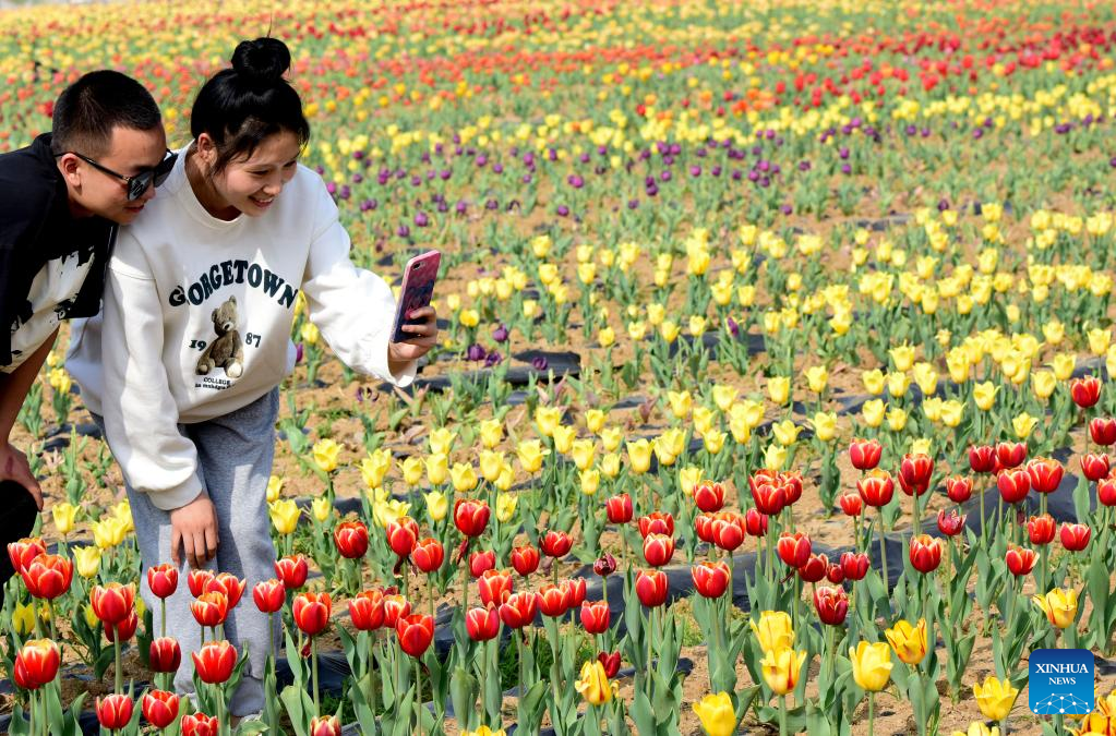 Tourists view tulips at a scenic spot in Suiping County, central China's Henan Procince, April 7, 2022. (Xinhua/Zhu Xiang)