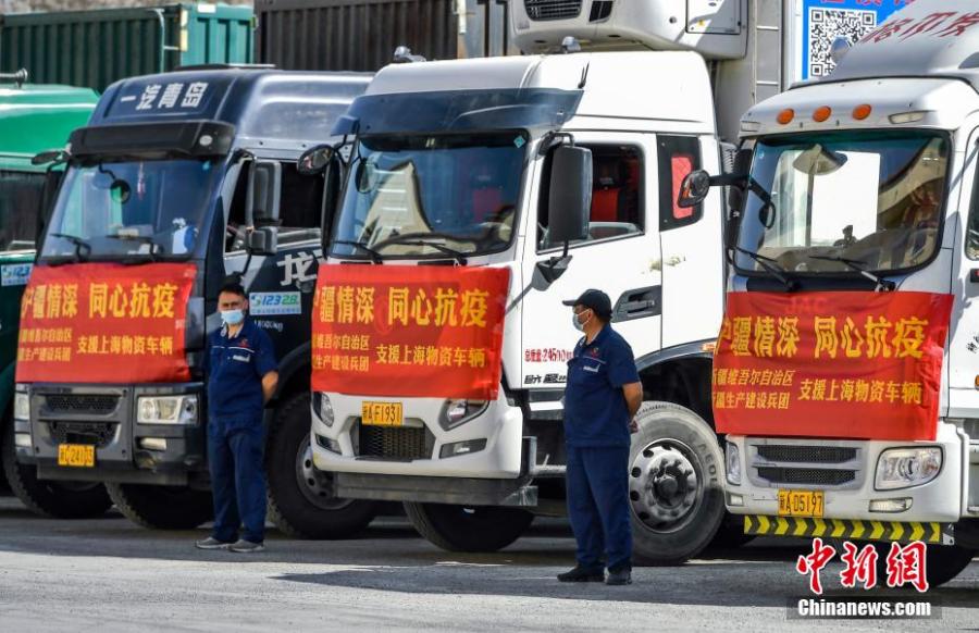 Photo shows the first batch of anti-pandemic supplies, including 16,000 pieces of dried fruit, depart from Urumqi, northwest China's Xinjiang Uyghur Autonomous Region, April 7, 2022. (Photo: China News Service/Liu Xin)