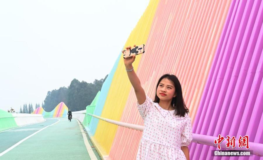 Located on Xituan road expressway, the bridge is 1,037 meters long and looks like a row of macarons with dazzling colors.