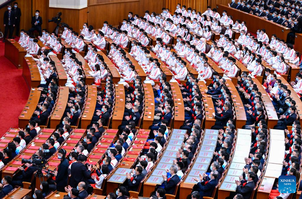A gathering to honor those who have made outstanding contributions to the Beijing 2022 Olympic Winter Games and the Beijing 2022 Paralympic Winter Games is held at the Great Hall of the People in Beijing, capital of China, April 8, 2022. (Xinhua/Zhai Jianlan)