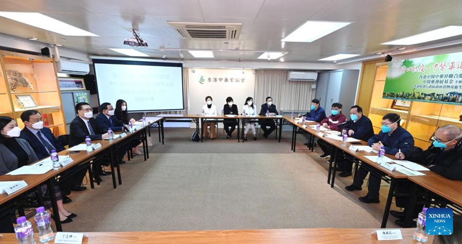 Traditional Chinese Medicine (TCM) experts from the Chinese mainland (R) meet with Hong Kong's TCM practitioners in Hong Kong, south China, April 3, 2022. (Xinhua)