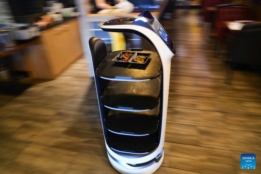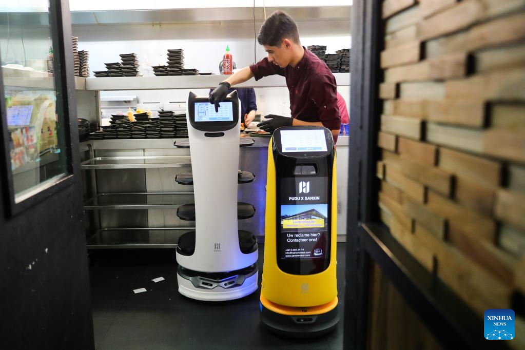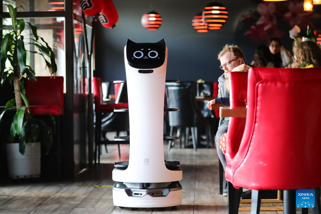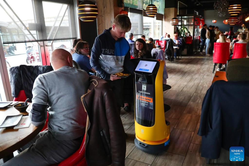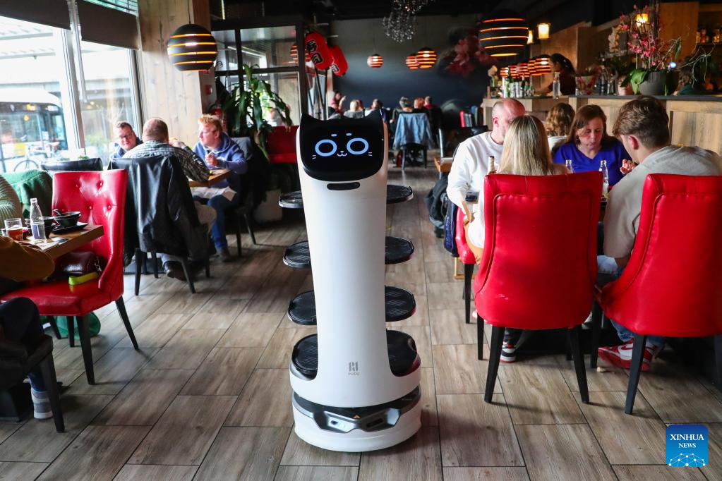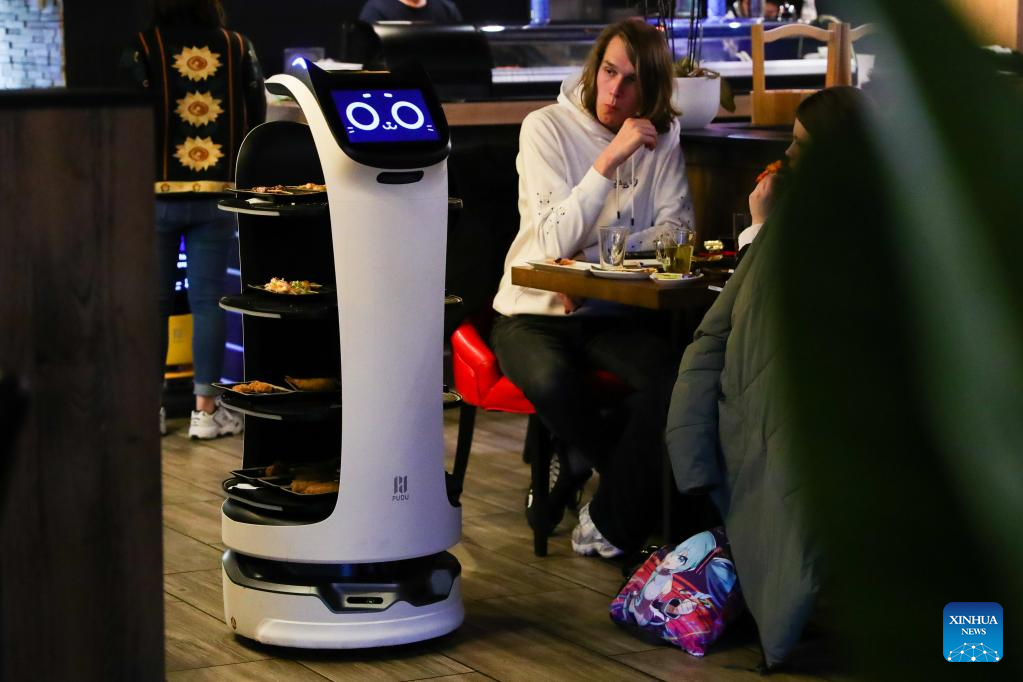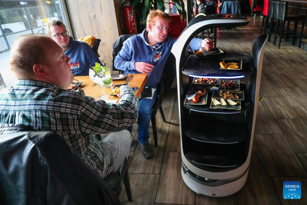 A robot serves dishes at a restaurant in Sint-Niklaas, East Flanders, Belgium, April 9, 2022. Two service robots, designed and manufactured in China, became the "stars" of a restaurant in Sint-Niklaas in Belgium. They not only reduced the cost for the restaurant, but also won popularity among the customers. (Xinhua/Zheng Huansong)