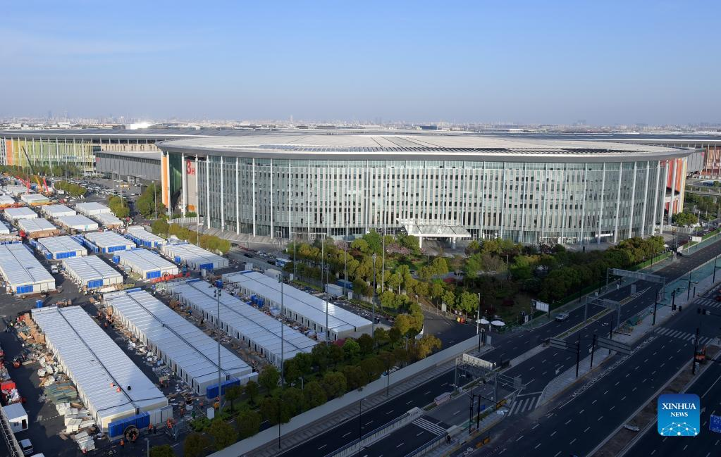 Photo taken on April 9, 2022 shows the exterior view of a makeshift hospital converted from the National Exhibition and Convention Center (Shanghai) in east China's Shanghai. (Xinhua/Li He)