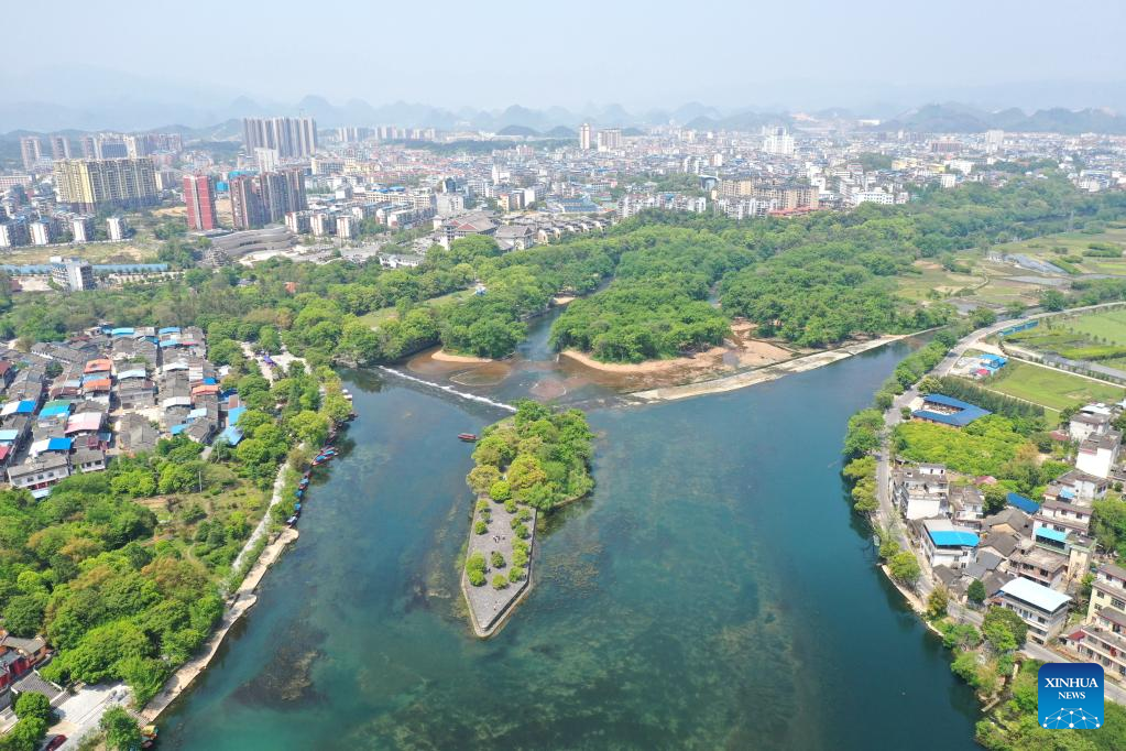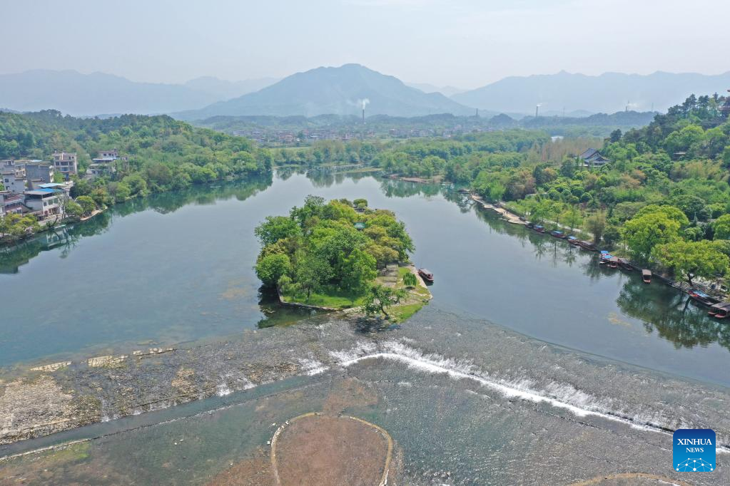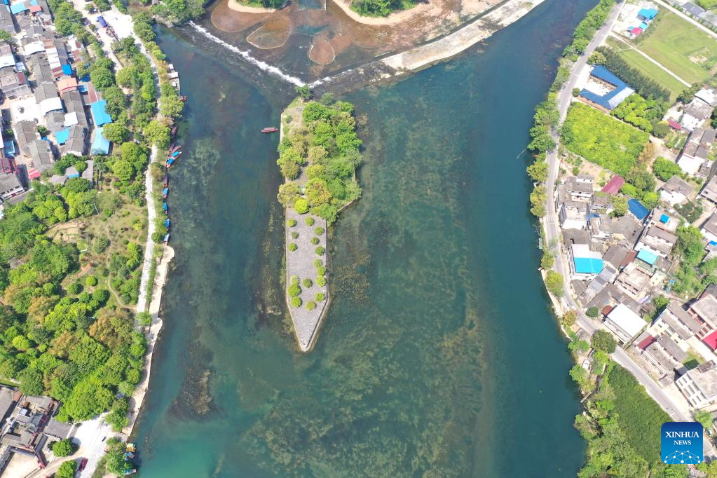 Aerial photo taken on April 9, 2022 shows Lingqu Canal in Xing'an County, south China's Guangxi Zhuang Autonomous Region. Lingqu, one of the world's oldest and most well-preserved artificial canals, was inscribed on the World Heritage Irrigation Structures in 2018. (Xinhua/Zhou Hua)