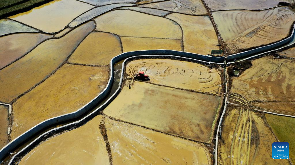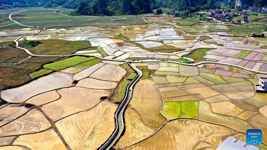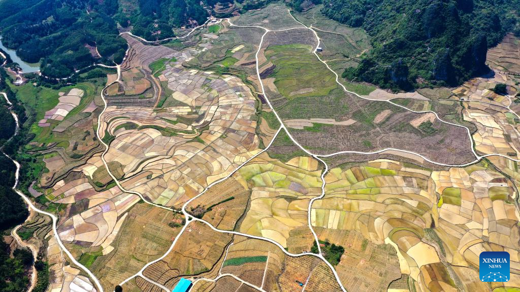 Aerial photo taken on April 8, 2022 shows the scenery of a planting base of selenium-rich rice in Longkou Village of Dahua Yao Autonomous County, south China's Guangxi Zhuang Autonomous Region. (Xinhua/Zhang Ailin)