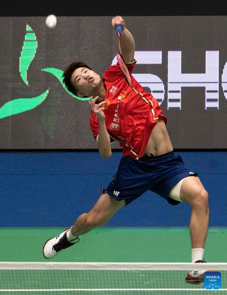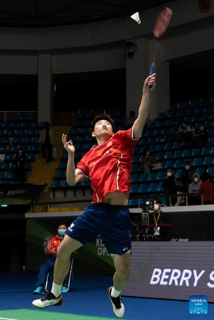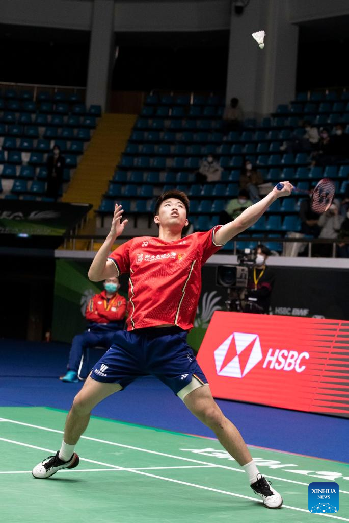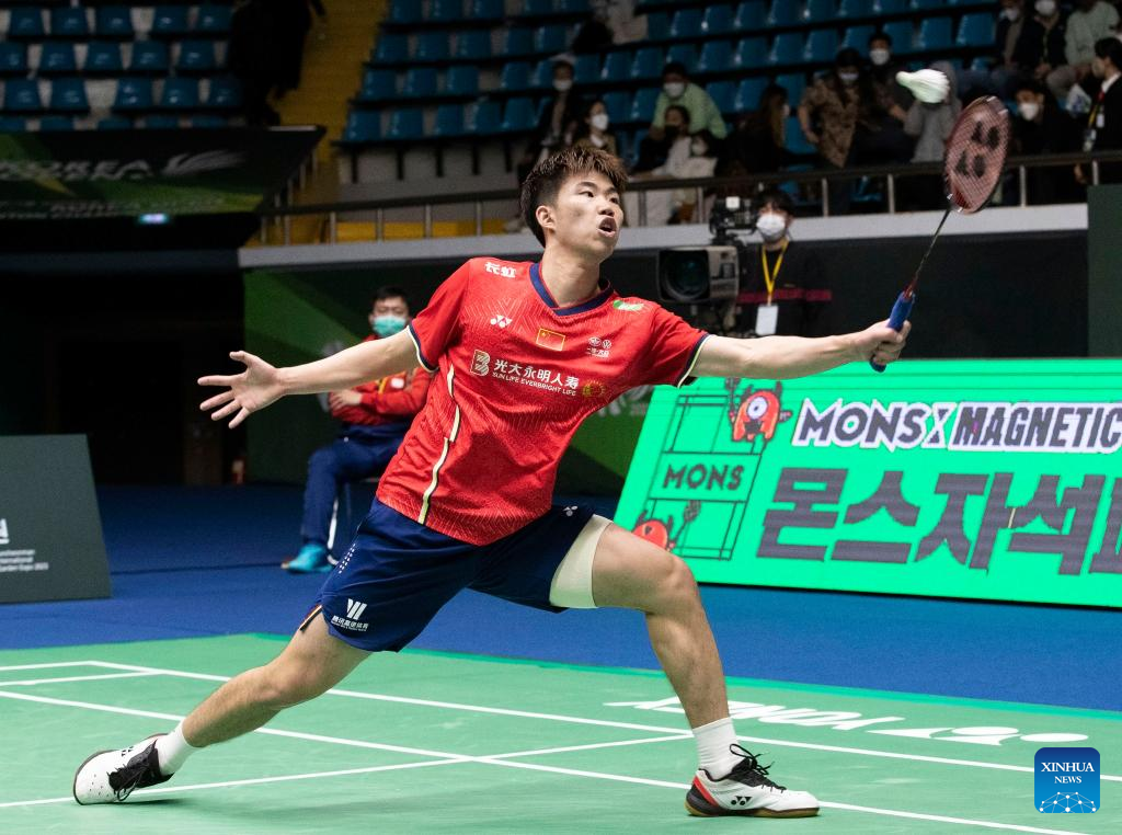 Weng Hongyang of China hits a return during the men's singles semifinal against Victor Svendsen of Denmark at the BWF Korea Open Badminton Championships 2022 in Suncheon, South Korea, April 9, 2022. (Photo by James Lee/Xinhua)