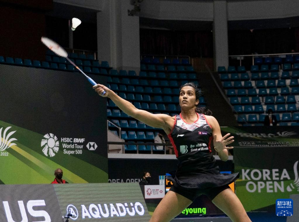Pusarla V. Sindhu of India hits a return during the women's singles semifinal match against An Seyoung of South Korea at the BWF Korea Open Badminton Championships 2022 in Suncheon, South Korea, April 9, 2022. (Photo by James Lee/Xinhua)