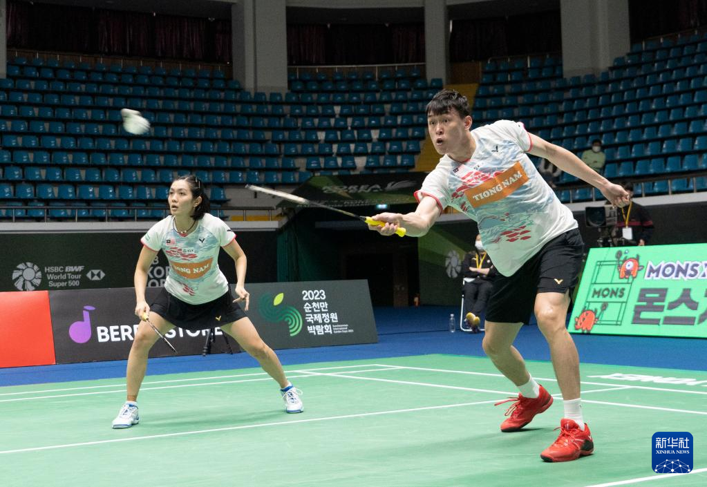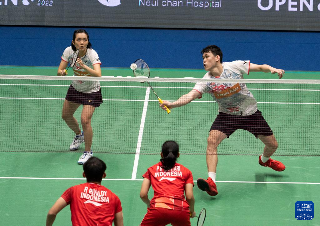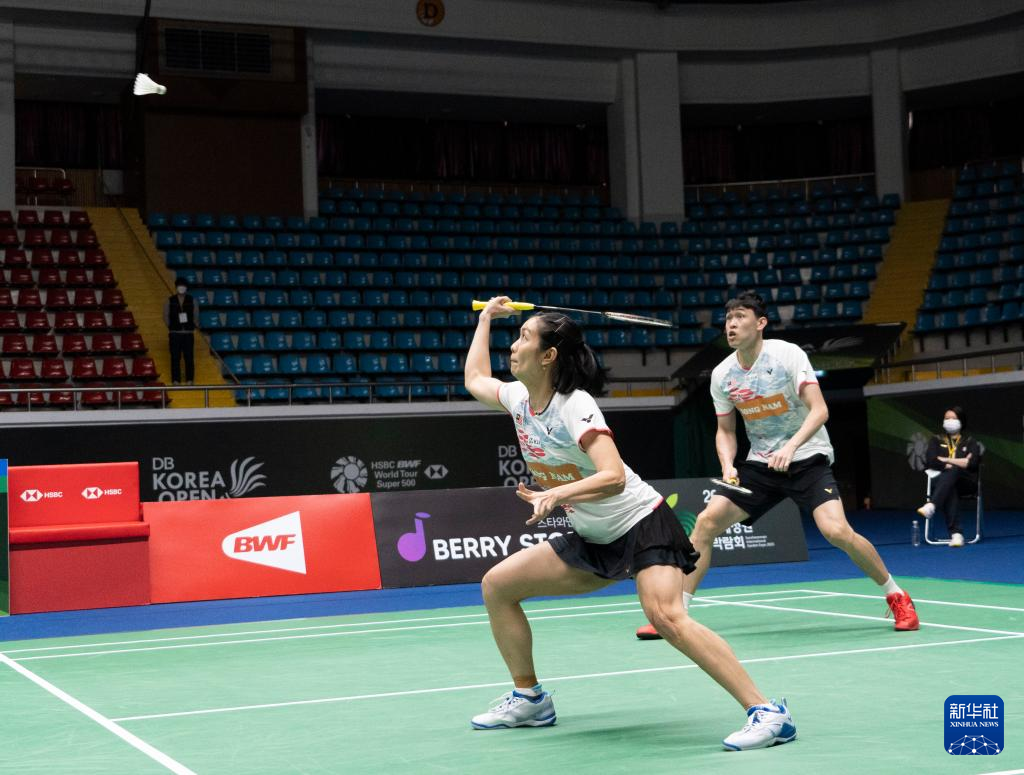 Tan Kian Meng (R)/Lai Pei Jing of Malaysia compete during the mixed doubles semifinals match against Rinov Rivaldy/Pitha Haningtyas Mentari of Indonesia at the BWF Korea Open Badminton Championships 2022 in Suncheon, South Korea, April 9, 2022. (Photo by James Lee/Xinhua)
