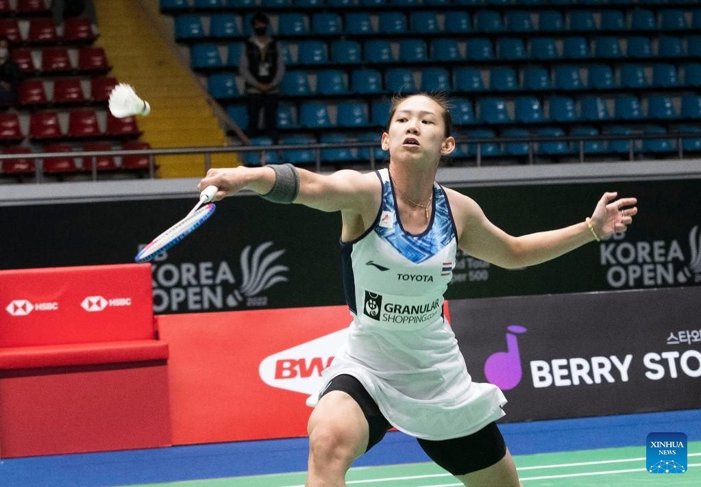 Pornpawee Chochuwong of Thailand hits a return during the women's singles semifinal match against Kim Gaeun of South Korea at the BWF Korea Open Badminton Championships 2022 in Suncheon, South Korea, April 9, 2022. (Photo by James Lee/Xinhua)