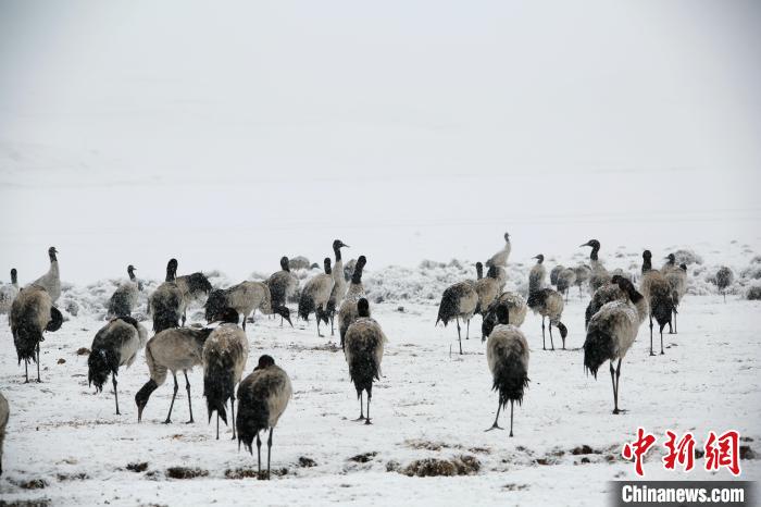Photo shows black-necked cranes in the snow at a nature reserve on April 5, 2022. (Photo/Wu Taiping)