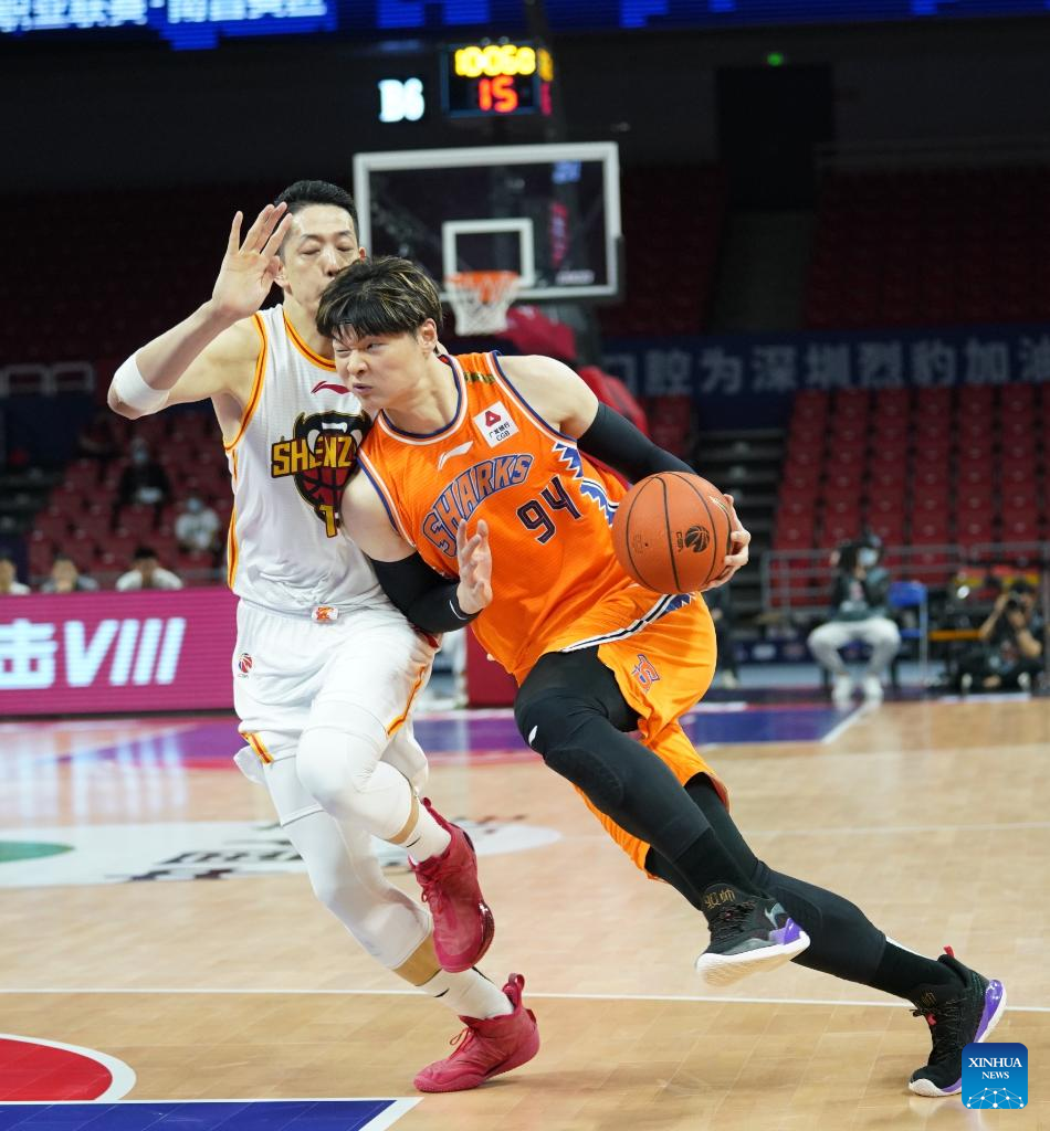 Wang Zhelin (R) of Shanghai Sharks breaks through during the 2nd round playoff match between Shanghai Sharks and Shenzhen Leopards at the 2021-2022 season of the Chinese Basketball Association (CBA) league in Nanchang, east China's Jiangxi Province, April 10, 2022. (Xinhua/Hu Chenhuan)