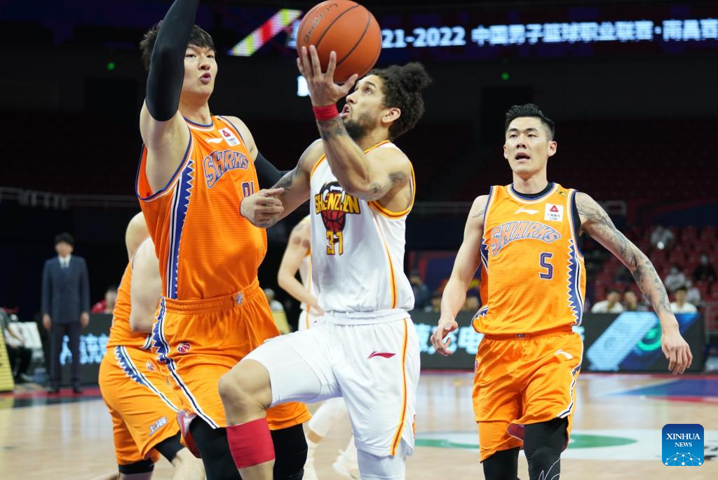 Askia Booker (C) of Shenzhen Leopards goes for the basket during the 2nd round playoff match between Shanghai Sharks and Shenzhen Leopards at the 2021-2022 season of the Chinese Basketball Association (CBA) league in Nanchang, east China's Jiangxi Province, April 10, 2022. (Xinhua/Hu Chenhuan)