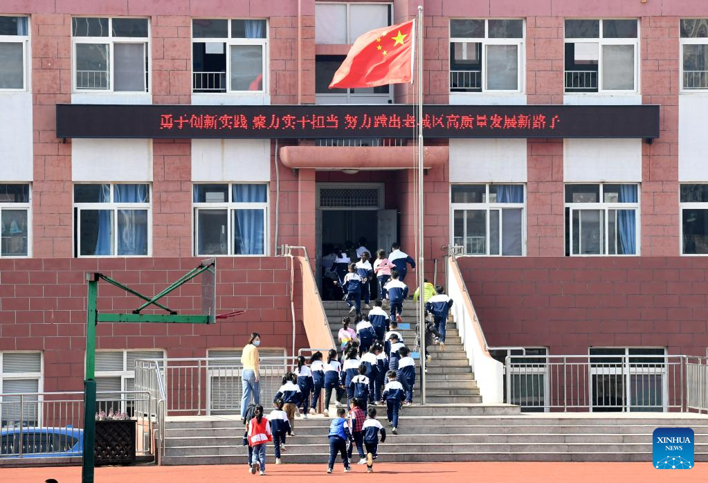 Students are seen after school at Qingdao Huachuan Road Primary School in Qingdao, east China's Shandong Province, April 11, 2022. Primary and middle schools in Qingdao resumed classes on Monday. (Xinhua/Li Ziheng)