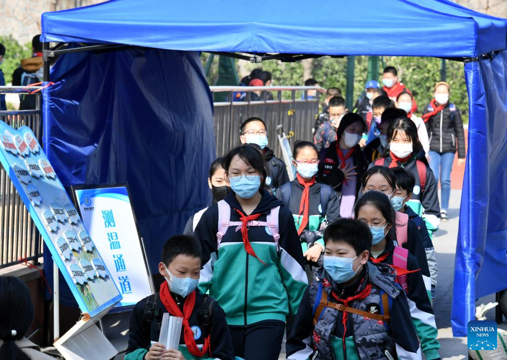 Students are seen at Qingdao Huachuan Road Primary School in Qingdao, east China's Shandong Province, April 11, 2022. Primary and middle schools in Qingdao resumed classes on Monday. (Xinhua/Li Ziheng)