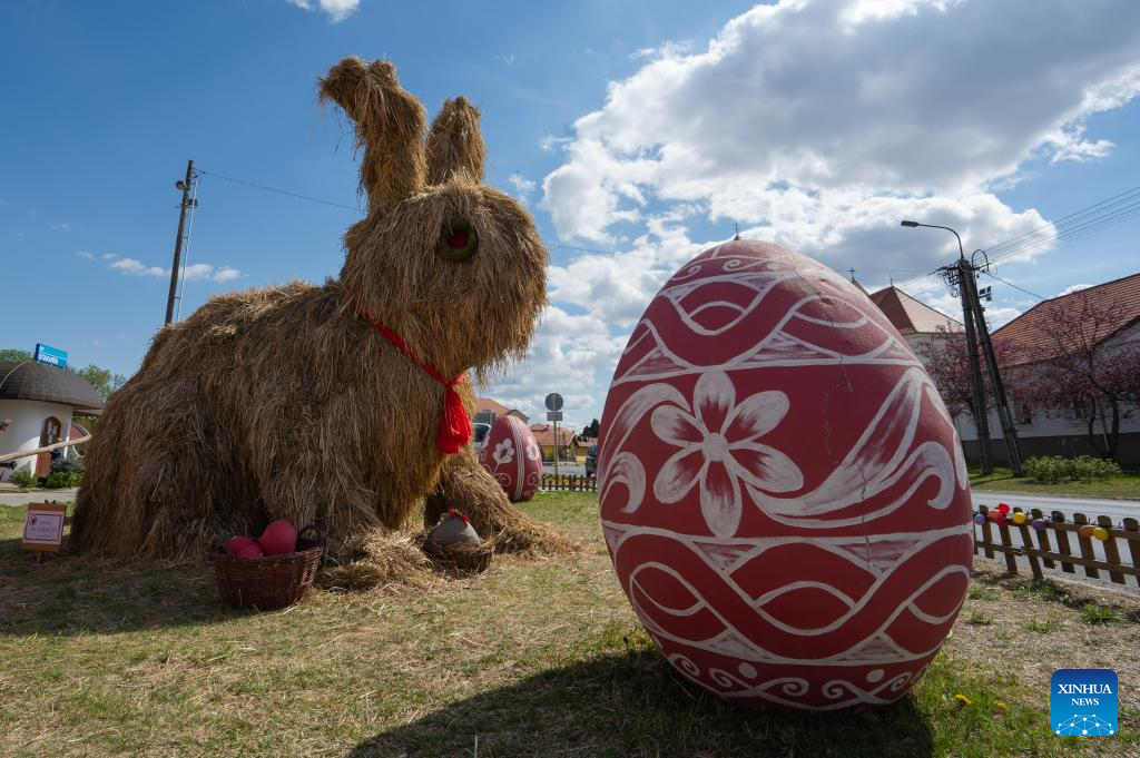 Easter decorations are seen in the main square of Kethely, Western Hungary, on April 11, 2022. (Photo by Attila Volgyi/Xinhua)