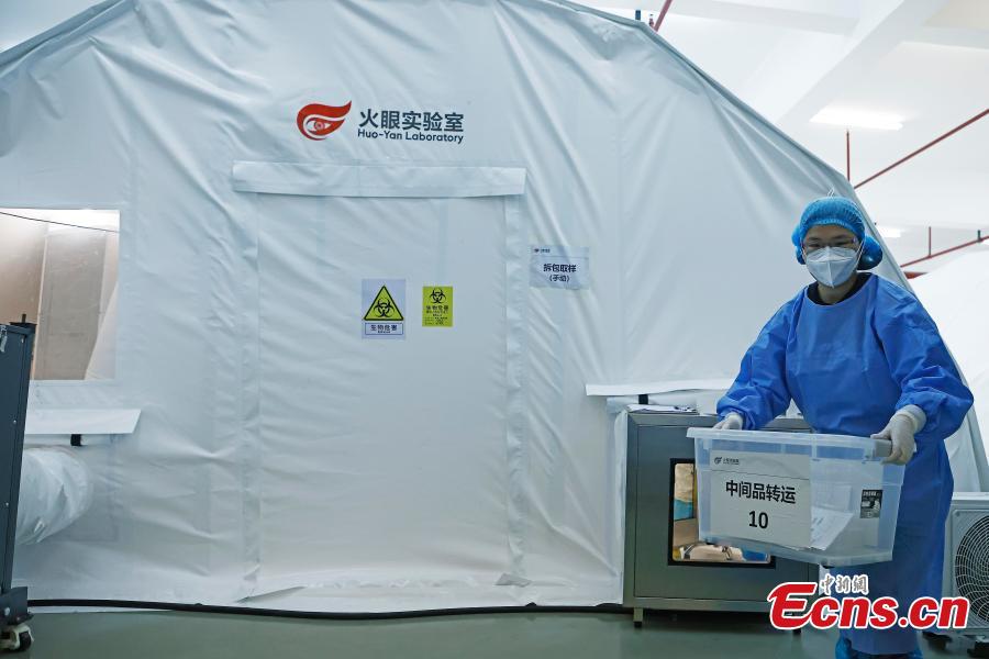 A medical worker carries nucleic acid samples at Pudong Huoyan, or Fire Eye nucleic acid test laboratory, in east China's Shanghai, April 11, 2022. (Photo: China News Service/Yin Liqin)