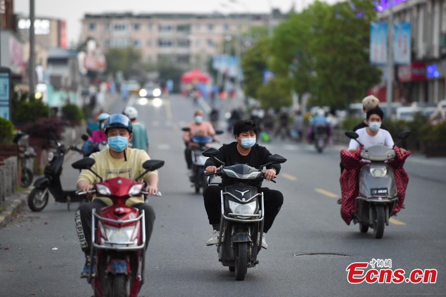 Residents ride electric bikes after some restrictions in the complex is lifted in east China's Shanghai, April 11, 2022. (Photo: China News Service/Tian Yuhao)
