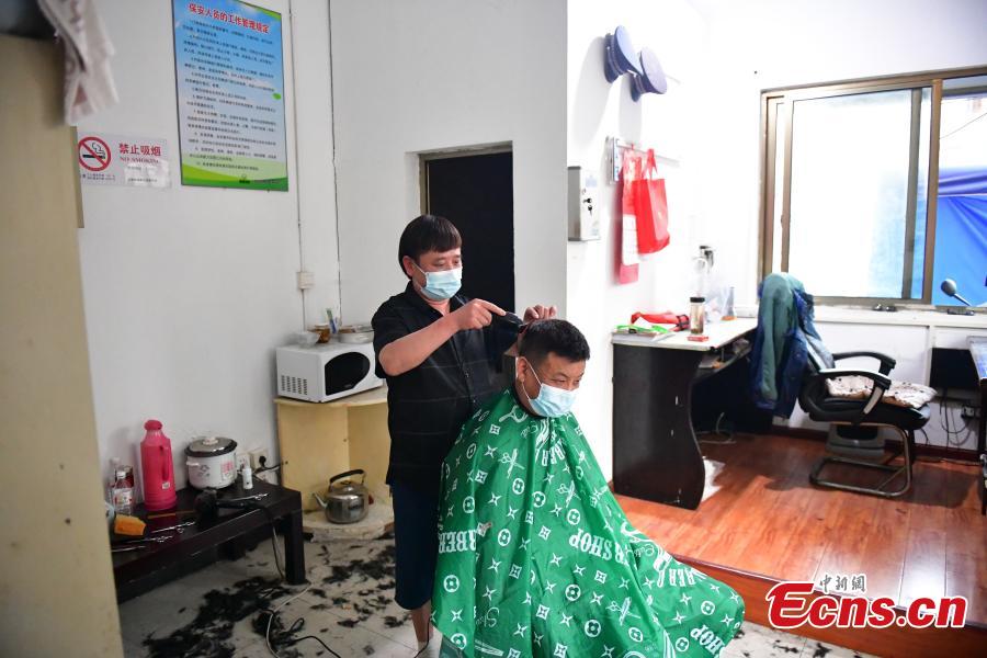 Photo shows a volunteer cutting hair for a resident after some restrictions in the complex are lifted in east China's Shanghai, April 11, 2022. (Photo: China News Service/Tian Yuhao)