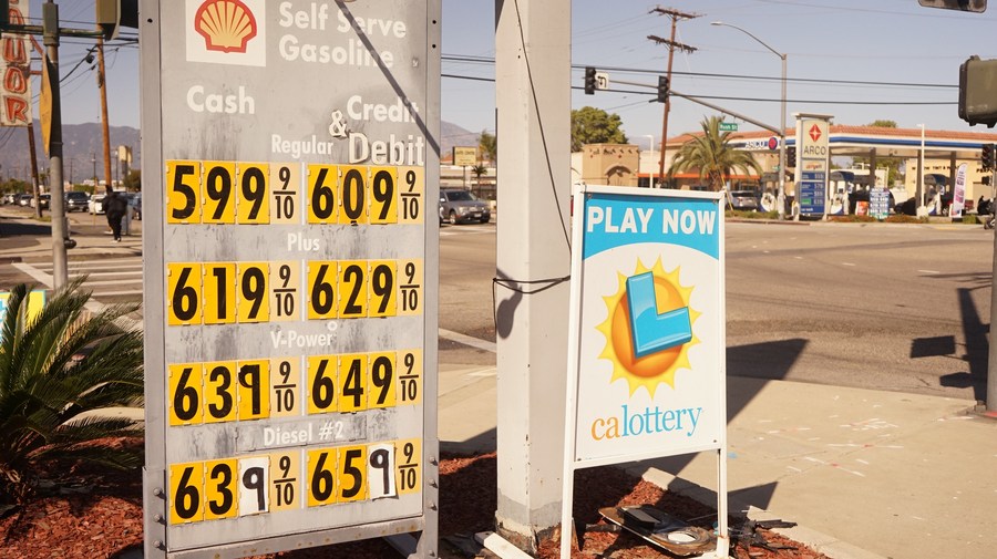 Gas prices are displayed at a gas station in Los Angeles County, California, the United States, on March 20, 2022. (Photo by Zeng Hui/Xinhua)
