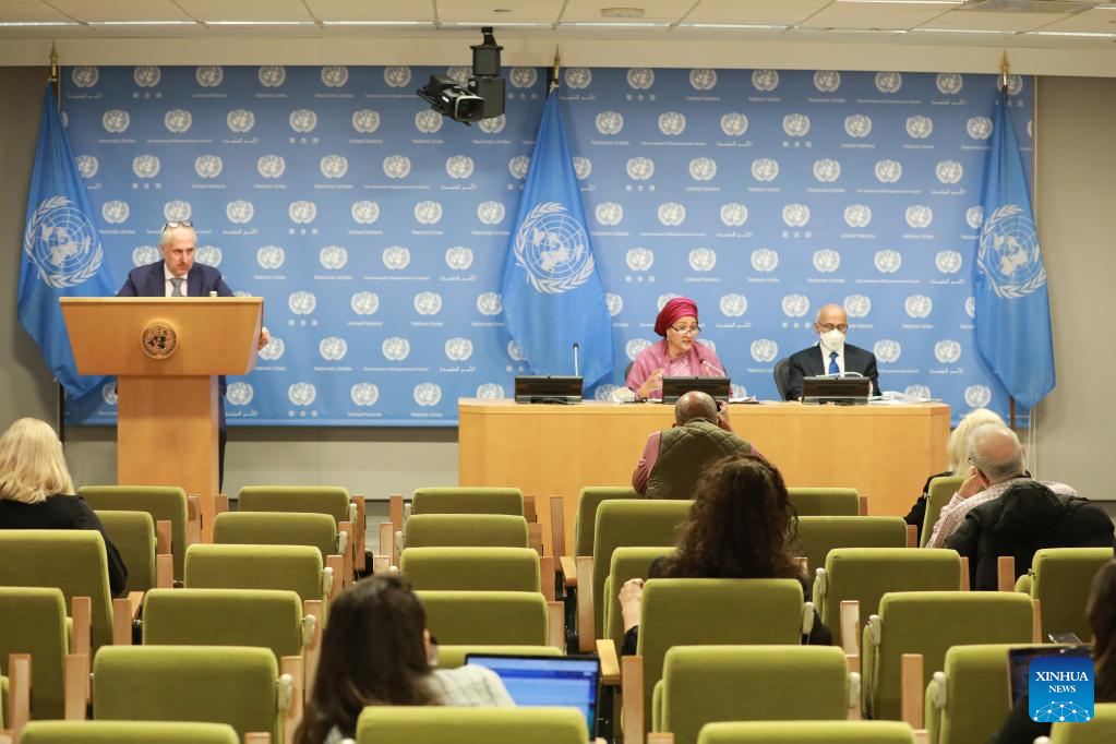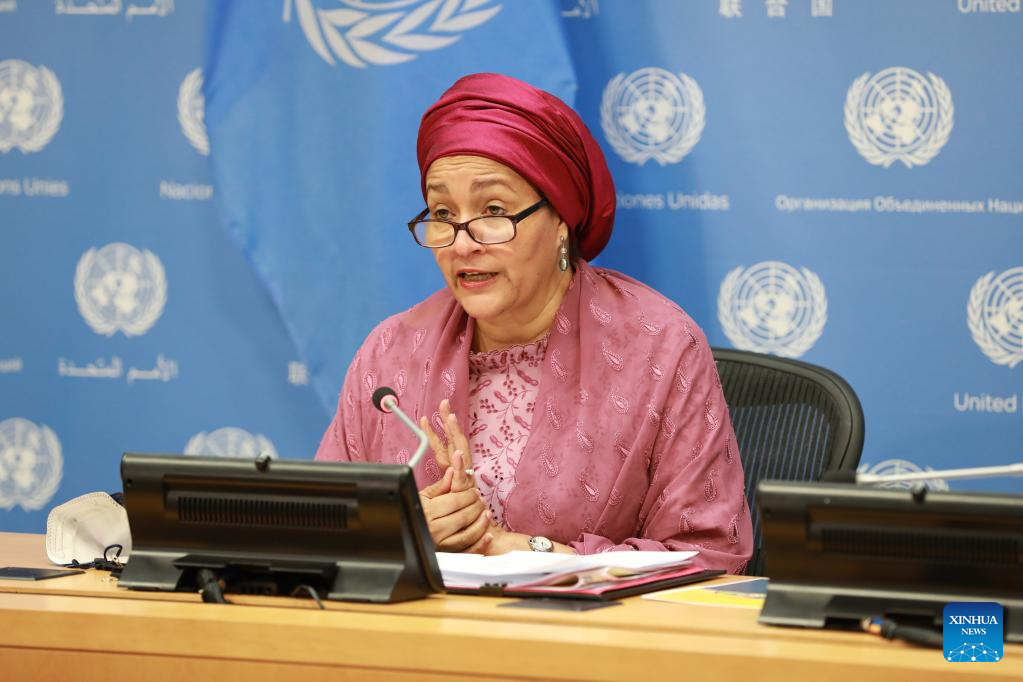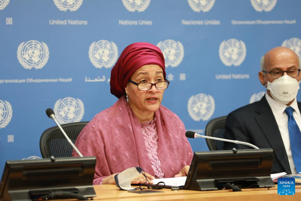 United Nations Deputy Secretary-General Amina Mohammed (C, Rear) speaks on the launch of "The 2022 Financing for Sustainable Development Report: Bridging the Finance Divide" at the UN headquarters in New York, on April 12, 2022. A "great finance divide" between rich and poor countries amid the COVID-19 pandemic poses a major setback for sustainable development, warns a UN report. (Xinhua/Xie E)