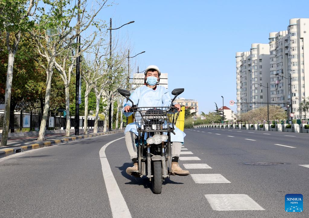 Wang Bin, Fuquan branch deliveryman of the delivery company YTO Express, delivers goods in east China's Shanghai, April 9, 2022. Cai Xiaobing is the branch manager of the delivery company YTO Express in Fuquan, Changning District, east China's Shanghai. Since early April, Cai has led his team to work around the clock to ensure delivery. They are now delivering daily supplies for about 2,000 households in several communities. (Xinhua/Chen Jianli)
