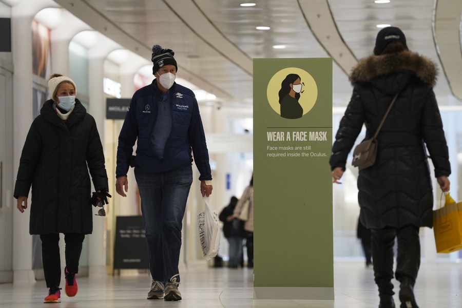 People walk past a signboard of wearing face masks at the Oculus of the World Trade Center in New York, the United States, March 29, 2022. (Xinhua/Wang Ying)