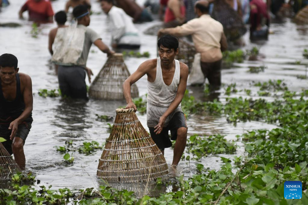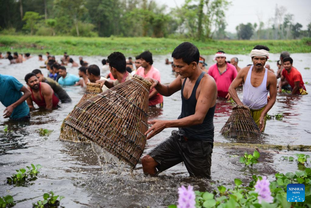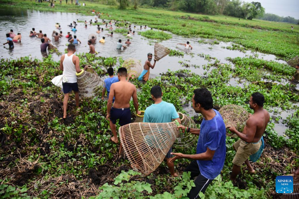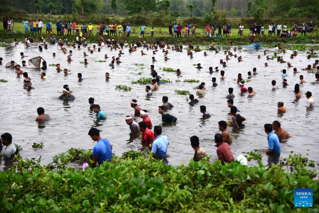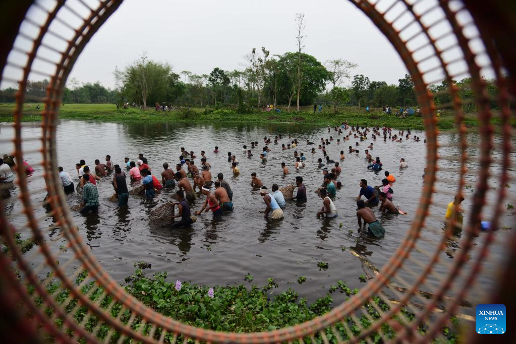 Villagers participate in a fishing event at Digholi Lake in Nagaon district of India's northeastern state of Assam, April 13, 2022. (Str/Xinhua)