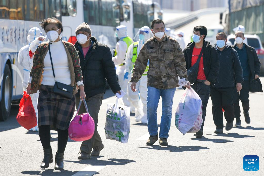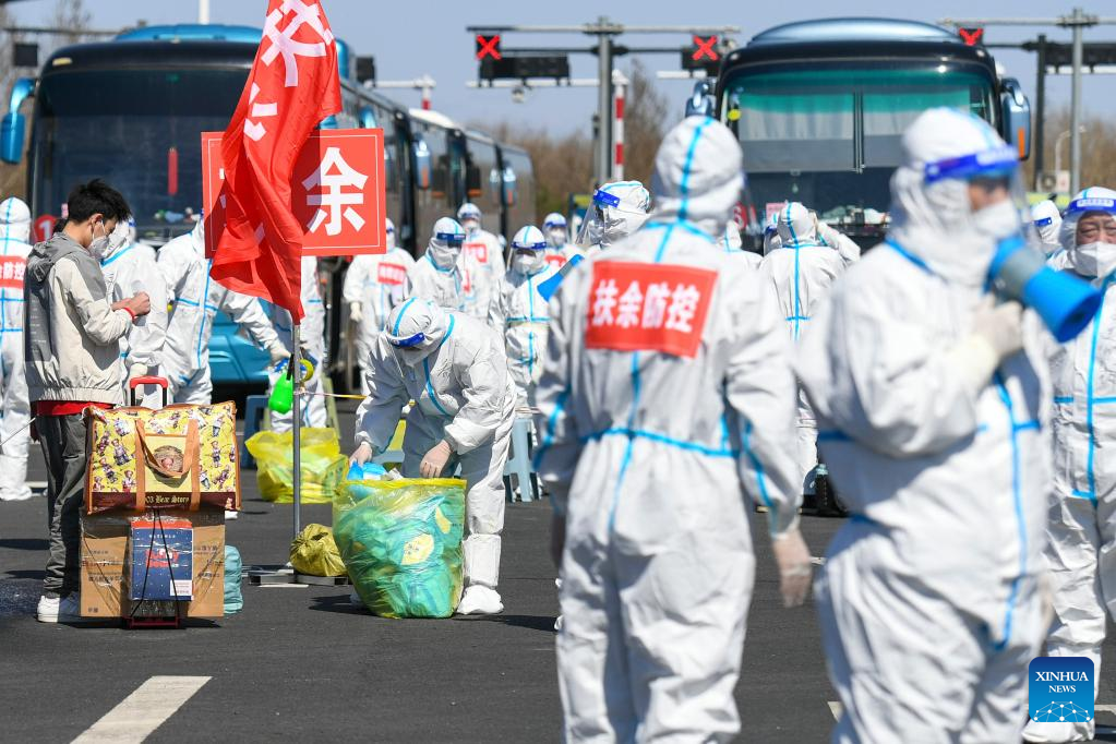 Farmers returning home for spring farming line up to board a chartered bus at a highway exit in Changchun City, northeast China's Jilin Province, April 12, 2022. Northeast China's Jilin Province, a major grain producer now fighting a COVID-19 outbreak, is issuing travel passes for farmers and sending them to farmland in chartered buses. By Sunday evening, around 100,000 farmers had reached their destinations. (Xinhua)