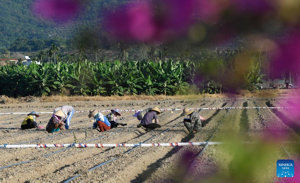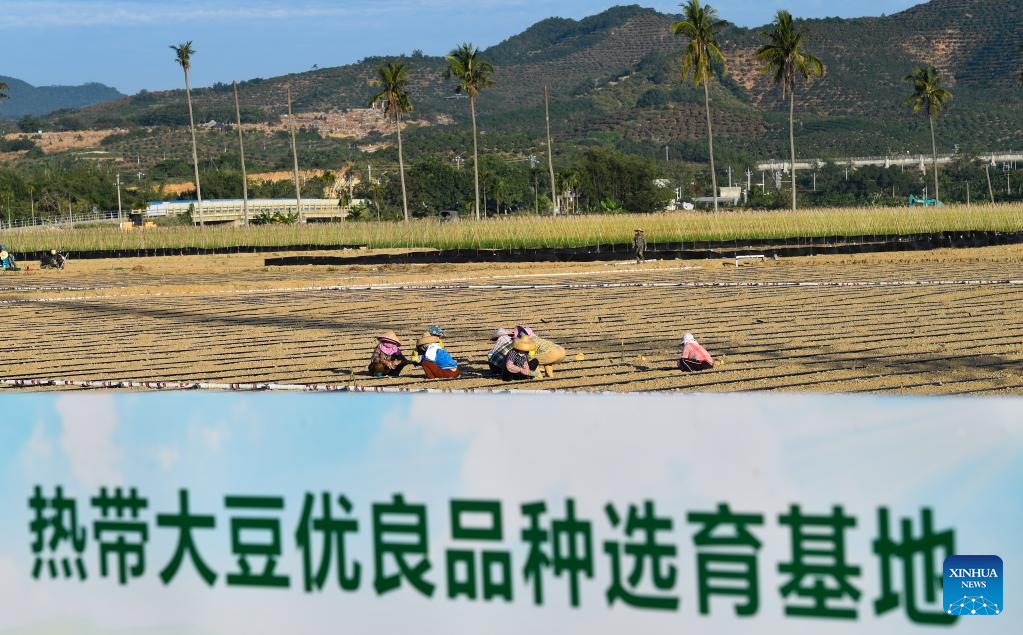 Villagers plant soybeans at the Nanfan experiment base in Sanya, south China's Hainan Province, Nov. 25, 2021. The Yazhou Bay Seed Laboratory, which opened in May last year, has gathered over 800 research staff to work toward seed industry innovation in Hainan in collaboration with 19 member institutions. The laboratory is situated in the Nanfan breeding base in Hainan, which is dubbed the "silicon valley" of China's seed industry. Thousands of scientists from across the country visit the base each year to undertake seed breeding, thanks to its unique light and heat resources. (Xinhua/Yang Guanyu)