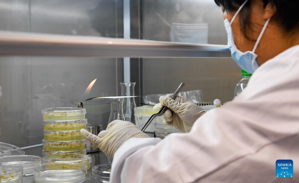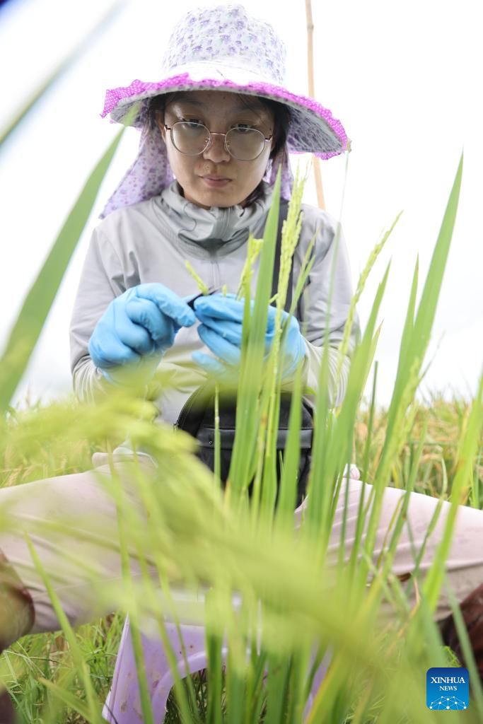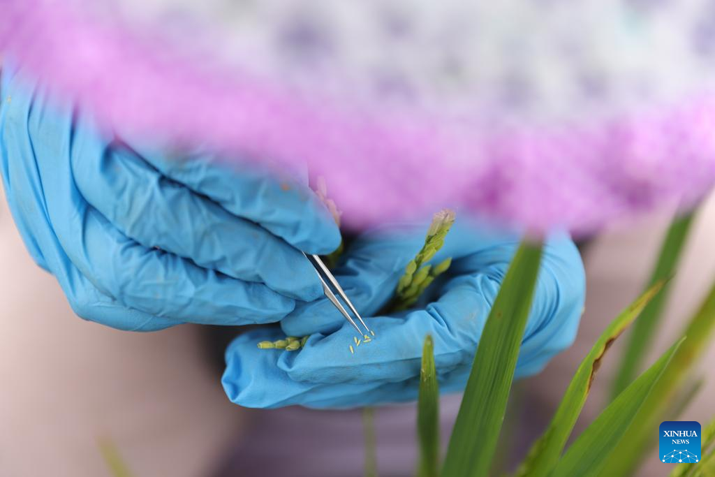 A researcher conducts rice hybridization experiments at the Nanfan seed breeding base in Sanya, south China's Hainan Province, April 1, 2022. The Yazhou Bay Seed Laboratory, which opened in May last year, has gathered over 800 research staff to work toward seed industry innovation in Hainan in collaboration with 19 member institutions. The laboratory is situated in the Nanfan breeding base in Hainan, which is dubbed the "silicon valley" of China's seed industry. Thousands of scientists from across the country visit the base each year to undertake seed breeding, thanks to its unique light and heat resources. (Xinhua/Zhang Liyun)