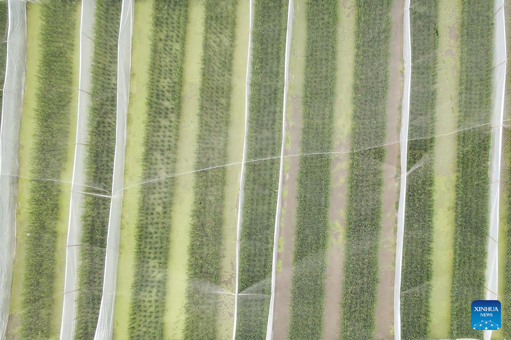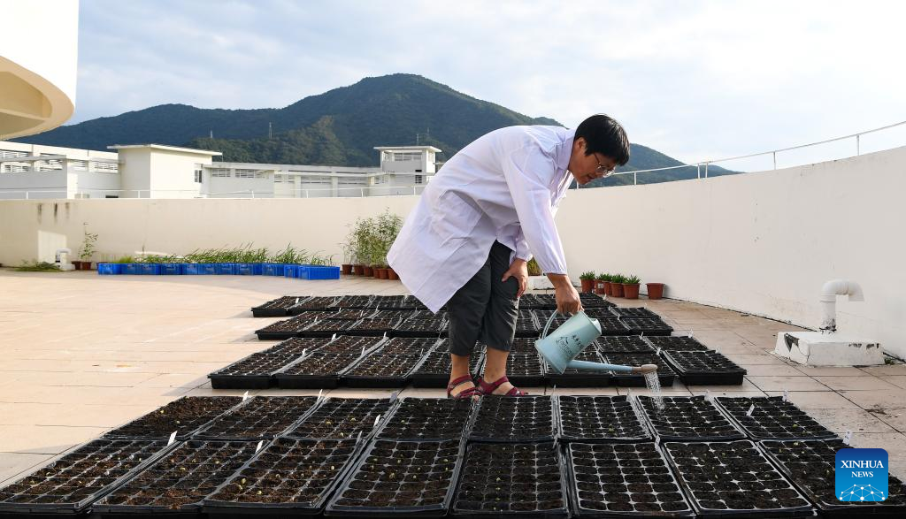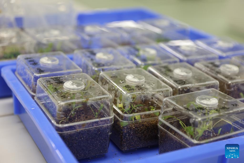 Photo taken on April 10, 2022 shows plant seedlings at the Yazhou Bay Seed Laboratory in Sanya, south China's Hainan Province. The Yazhou Bay Seed Laboratory, which opened in May last year, has gathered over 800 research staff to work toward seed industry innovation in Hainan in collaboration with 19 member institutions. The laboratory is situated in the Nanfan breeding base in Hainan, which is dubbed the "silicon valley" of China's seed industry. Thousands of scientists from across the country visit the base each year to undertake seed breeding, thanks to its unique light and heat resources. (Xinhua/Zhang Liyun)