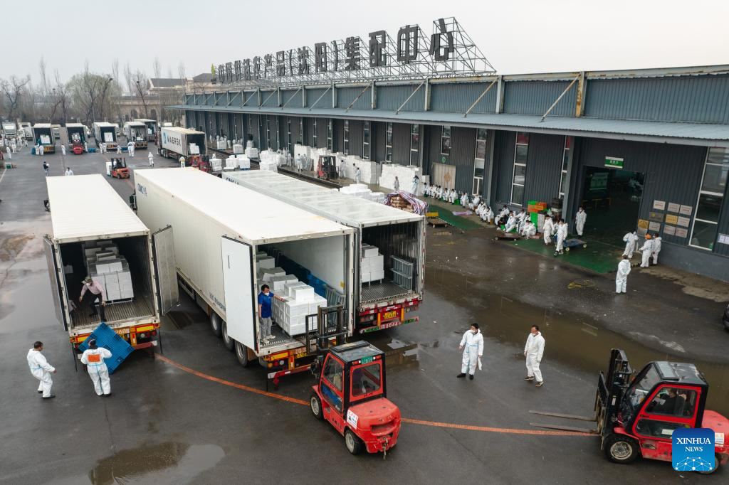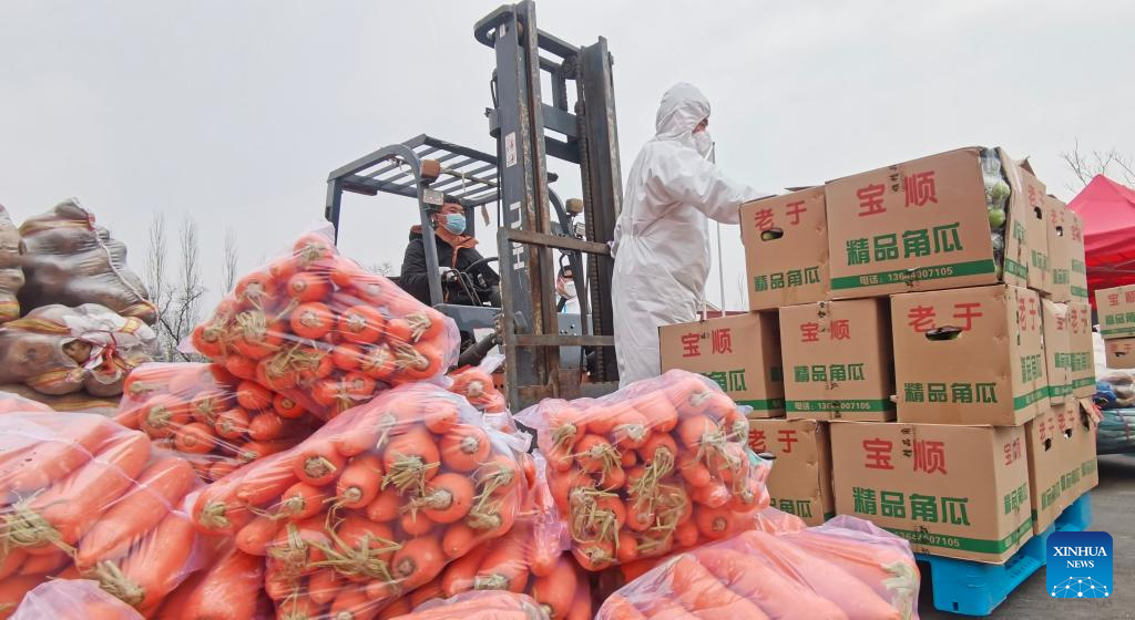 Volunteers transport vegetable in an agricultural products distribution center in Shenyang, northeast China's Liaoning Province, April 11, 2022. The commercial department of Liaoning organized about 2,300 tons of rice, flour, cooking oil, vegetables and other food for citizens in Shanghai to overcome a local COVID-19 resurgence. The first batch of 900 tons of living materials were shipped from Dalian on Tuesday. (Xinhua)
