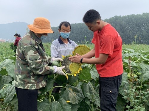Wang Yingzhao, a postgraduate student at the China Agricultural University who is stationed at a “science and technology backyard” in Xifangezhuang village, Pinggu district, Beijing, harvests oil sunflowers with local farmers. (Photo/China Agricultural University)