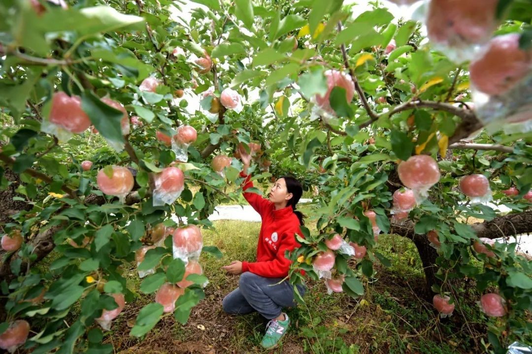 A graduate student from the China Agricultural University, who is stationed at a “science and technology backyard”, harvests apples together with local farmers in Xianggongzhuang village, Huaiqiao township, Quzhou county, north China’s Hebei province, Oct. 30, 2020. (Photo/Hu Haijun)